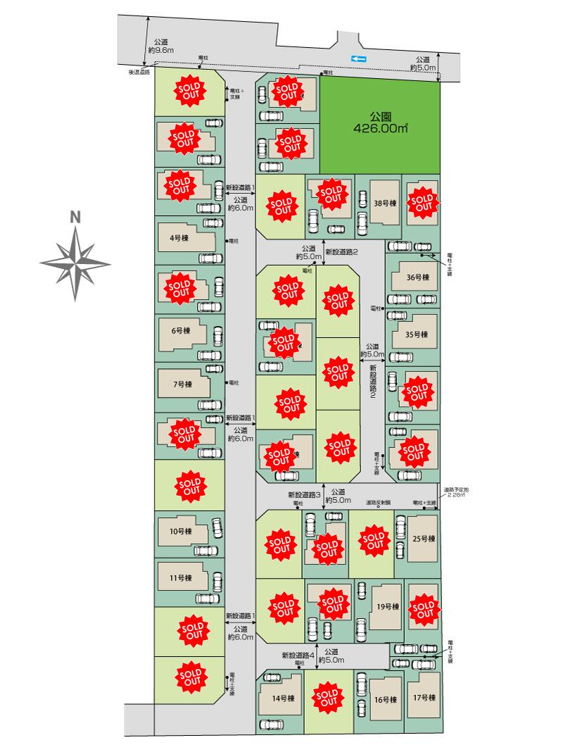 | 用途地域 | 第一種低層住居専用地域 | 接道 | 北側約5.0m・9.6m公道、新設道路1約6.0m公道、新設道路2・3・4約5.0m公道 | |