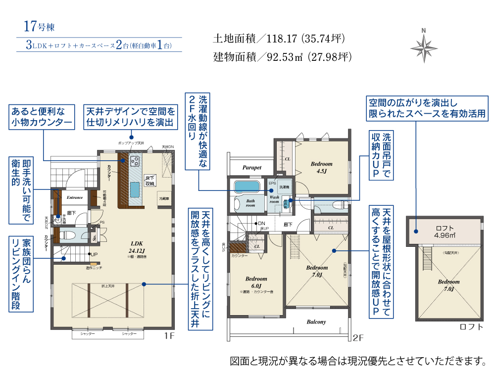 土地面積 118.17m² ・建物面積 92.53m² ・駐車場2台