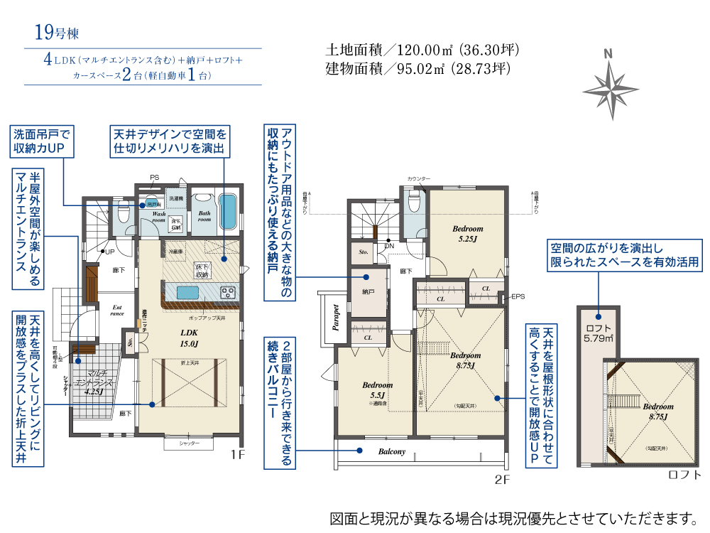 土地面積 120.00m² ・建物面積 95.02m² ・駐車場2台