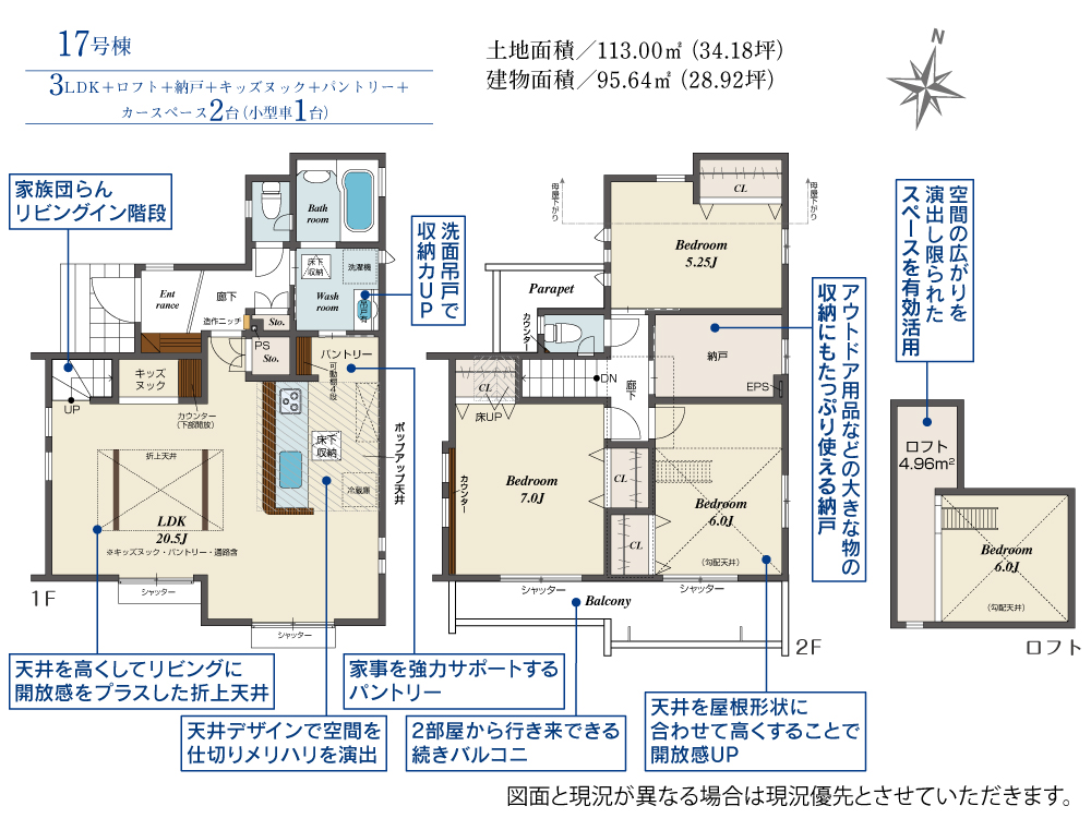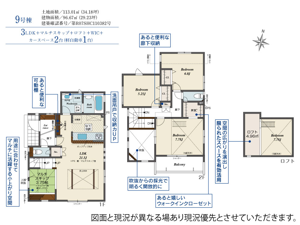 □宿泊に便利な2WAY和室 □家族団らんリビングイン階段 □空間の広がりを演出し限られたスペースを有効活用したロフト