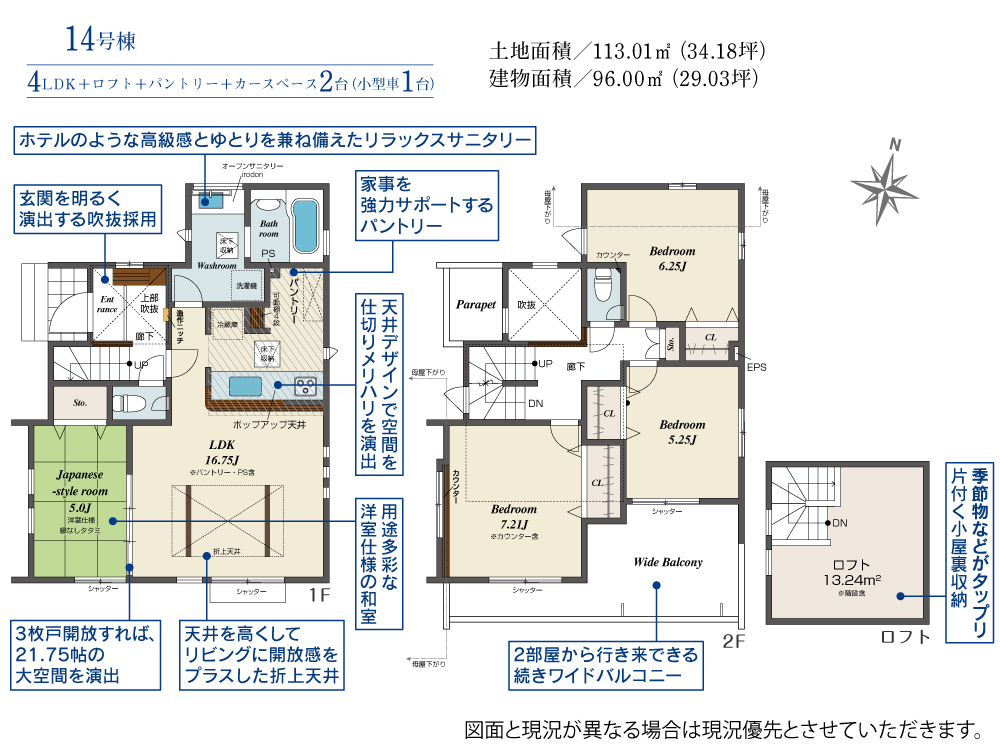 土地面積 113.01m² ・建物面積 96.00m² ・駐車場2台