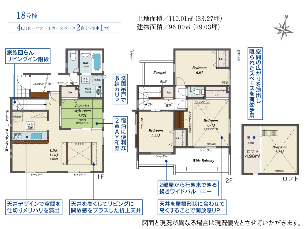 土地面積 110.01m² ・建物面積 96.00m² ・駐車場2台