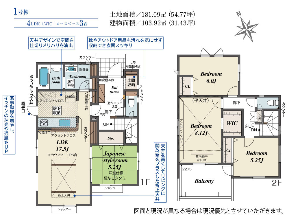 土地面積 181.09m² ・建物面積 103.92m² ・駐車場3台