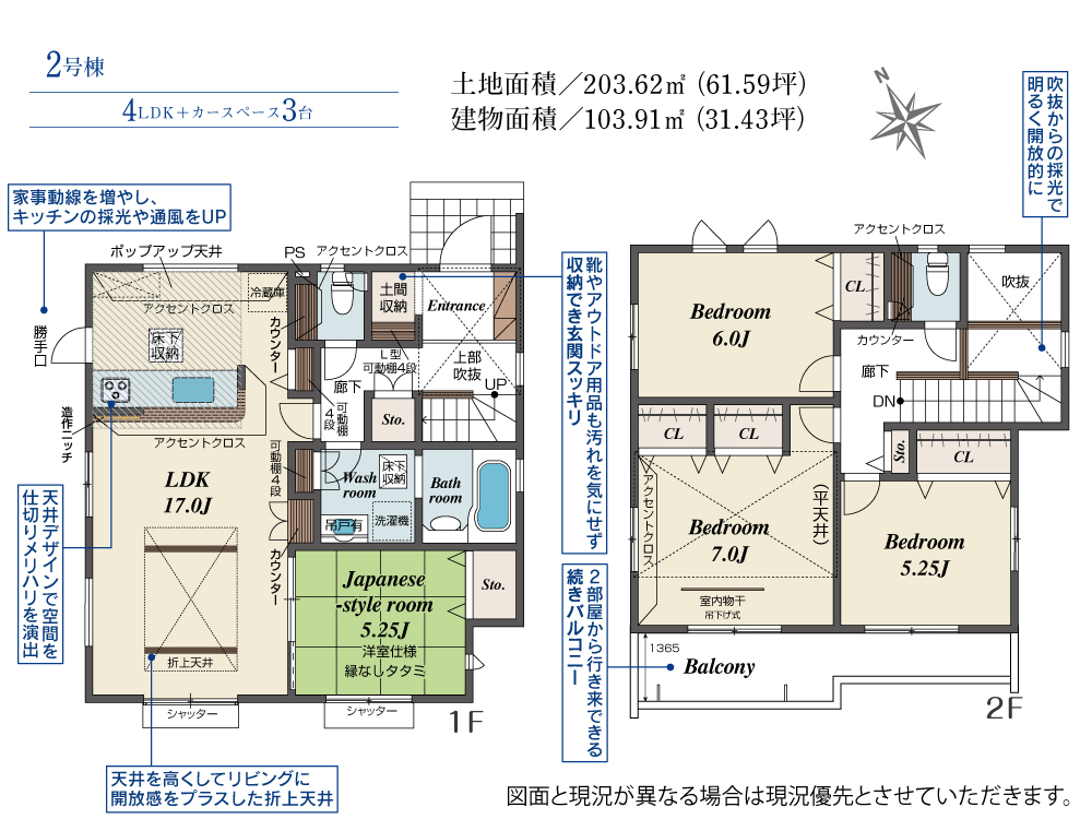 玄関吹き抜け、和室、パントリー収納、WIC、インナーバルコニー、充実した4LDK2階建て