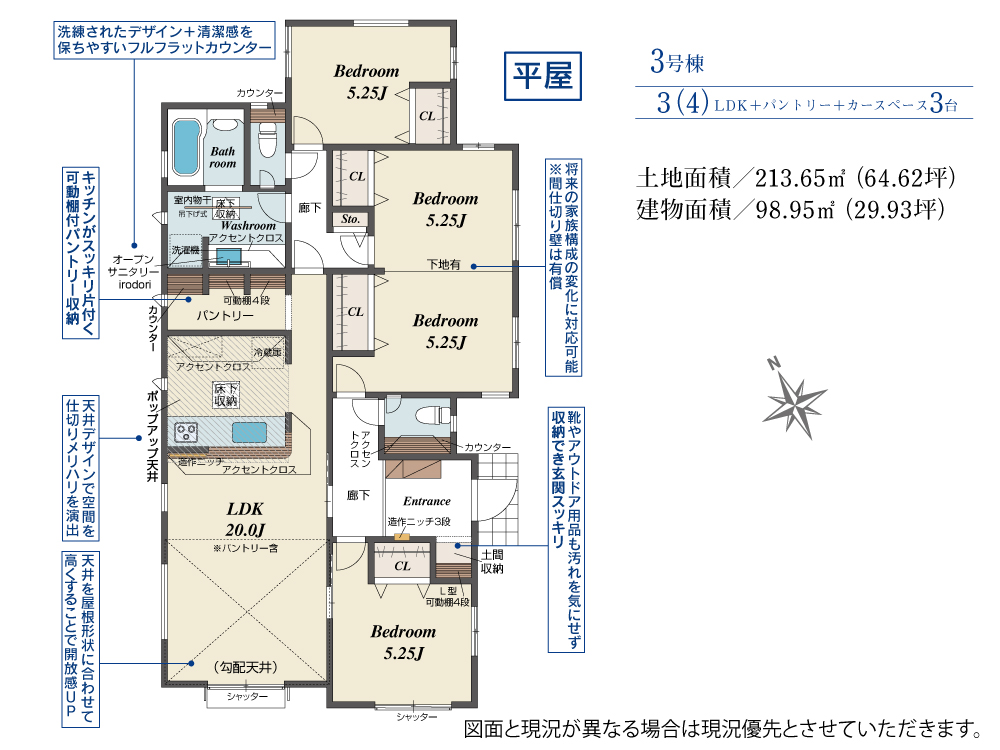 ●たっぷり収納できる!ひろびろパントリーが魅力的 ●LDK20.0帖ある広々したリビング。勾配天井でさらに解放感演出 ●お天気気にせずお洗濯ができる室内物干し装備