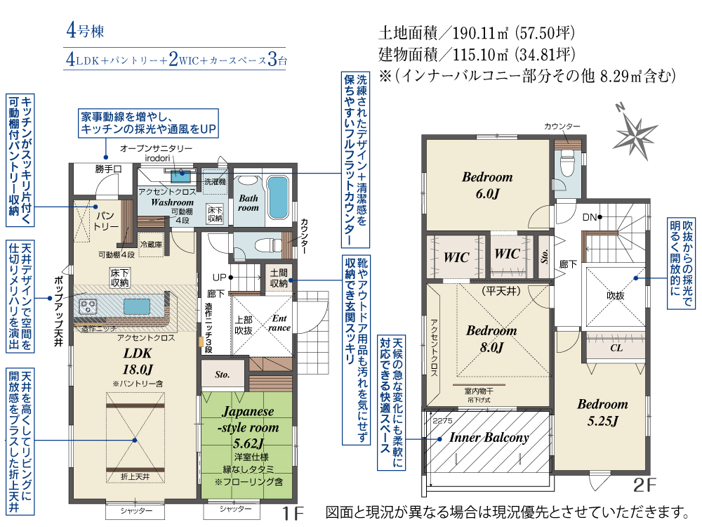 土地面積 190.11m² ・建物面積 115.10m² ・駐車場3台