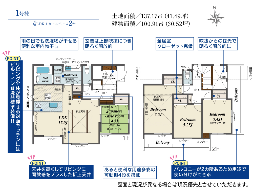 土地面積 137.17m² ・建物面積 100.91m² ・駐車場2台