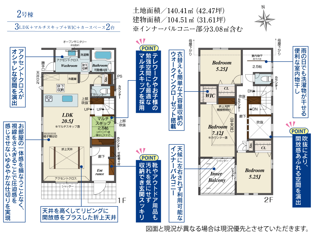 土地面積 140.41m² ・建物面積 104.51m² ・駐車場2台