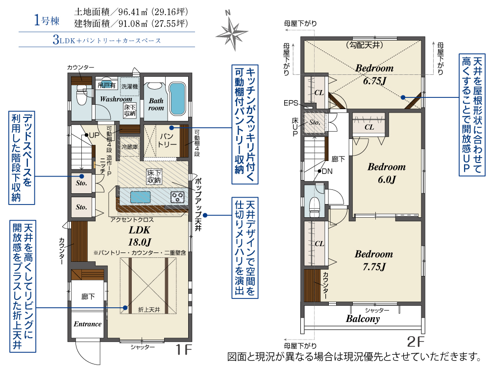 土地面積 96.41m² ・建物面積 91.08m² ・駐車場1台