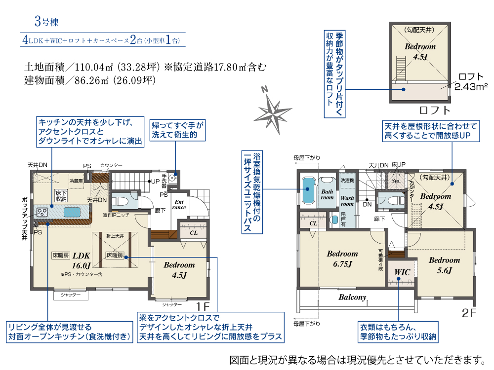 土地面積 110.04m² ・建物面積 86.26m² ・駐車場2台