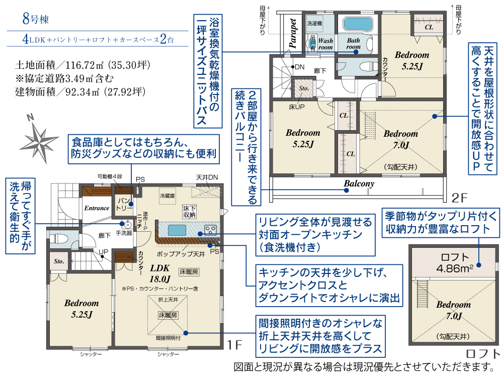 土地面積 116.72m² ・建物面積 92.34m² ・駐車場2台