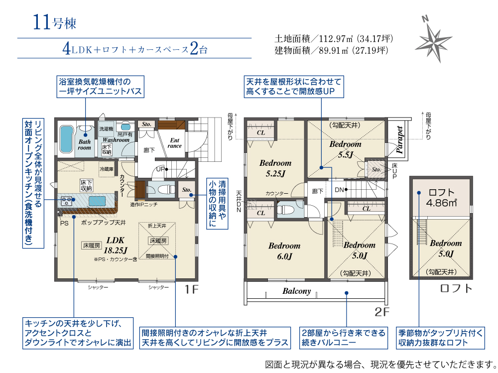 土地面積 112.97m² ・建物面積 89.91m² ・駐車場2台