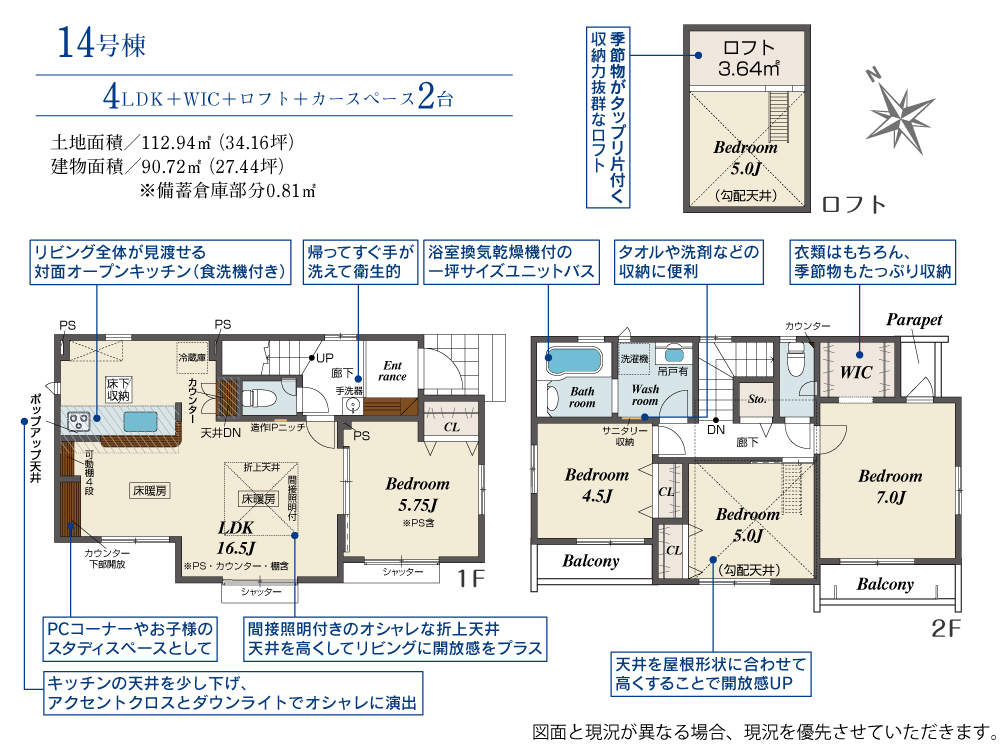 土地面積 112.94m² ・建物面積 90.72m² ・駐車場2台