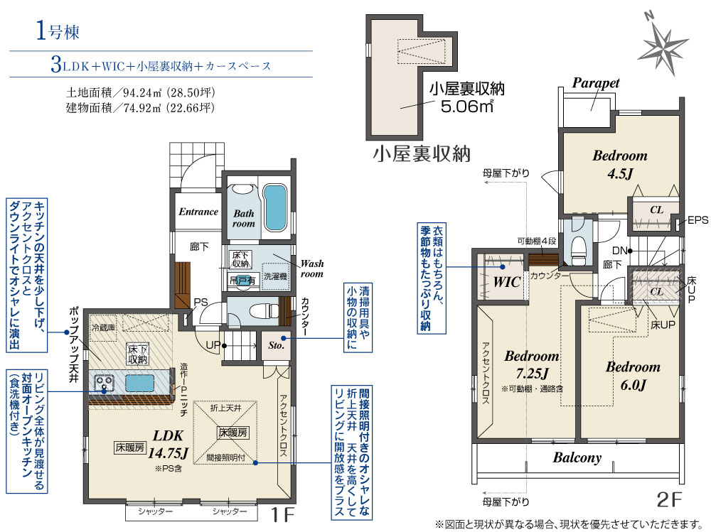 土地面積 94.24m² ・建物面積 74.92m² ・駐車場1台
