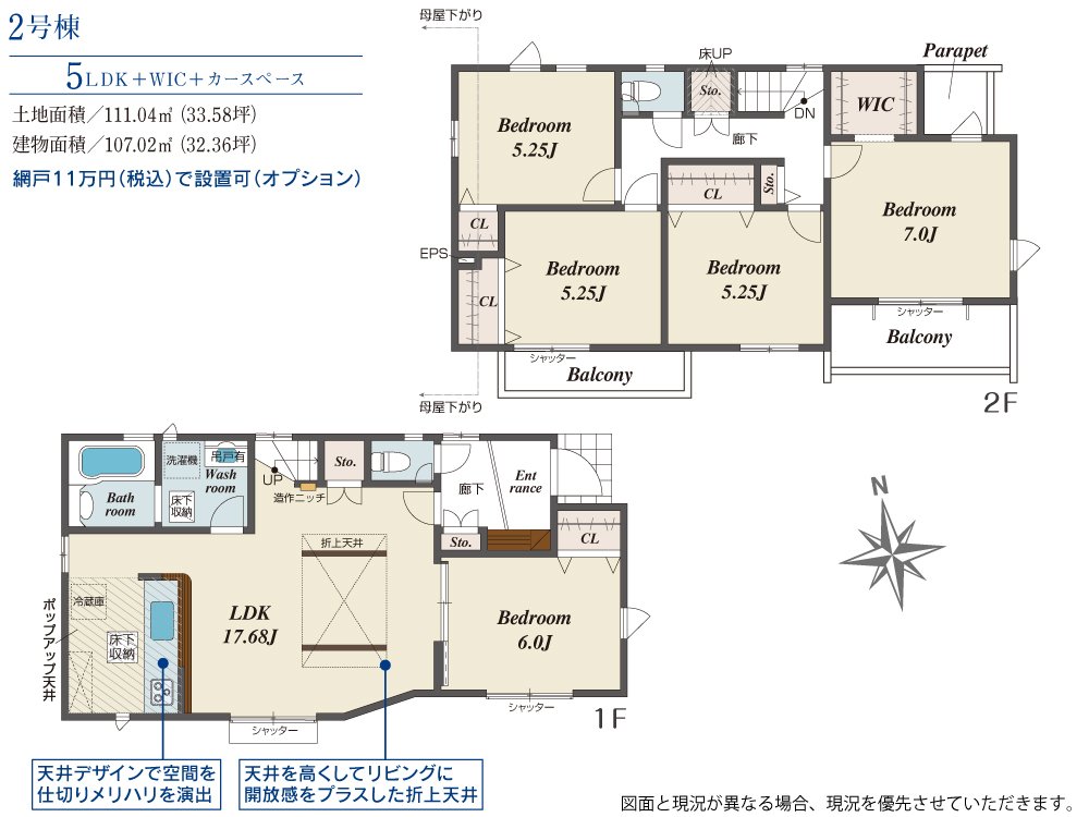 土地面積 111.04m² ・建物面積 107.02m² ・駐車場1台
