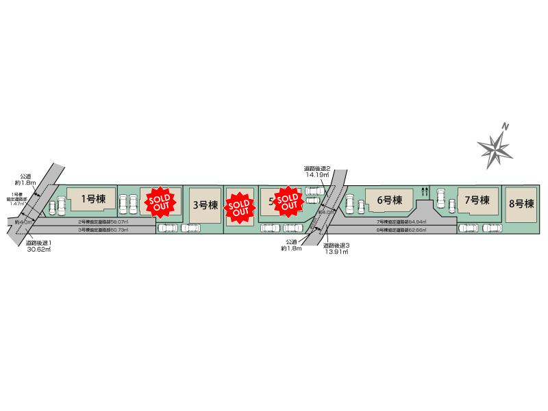 | その他 | 【協定道路】敷地面積に含む 1号棟:1.47m2、2号棟:58.07m2、3号棟:60.73m2、7号棟:84.94m2、8号棟:62.66m2 【セットバック】済 ①30.62m2、②14.19m2、③13.91m2 ※大和市帰属予定 【その他法令】準防火地域 |