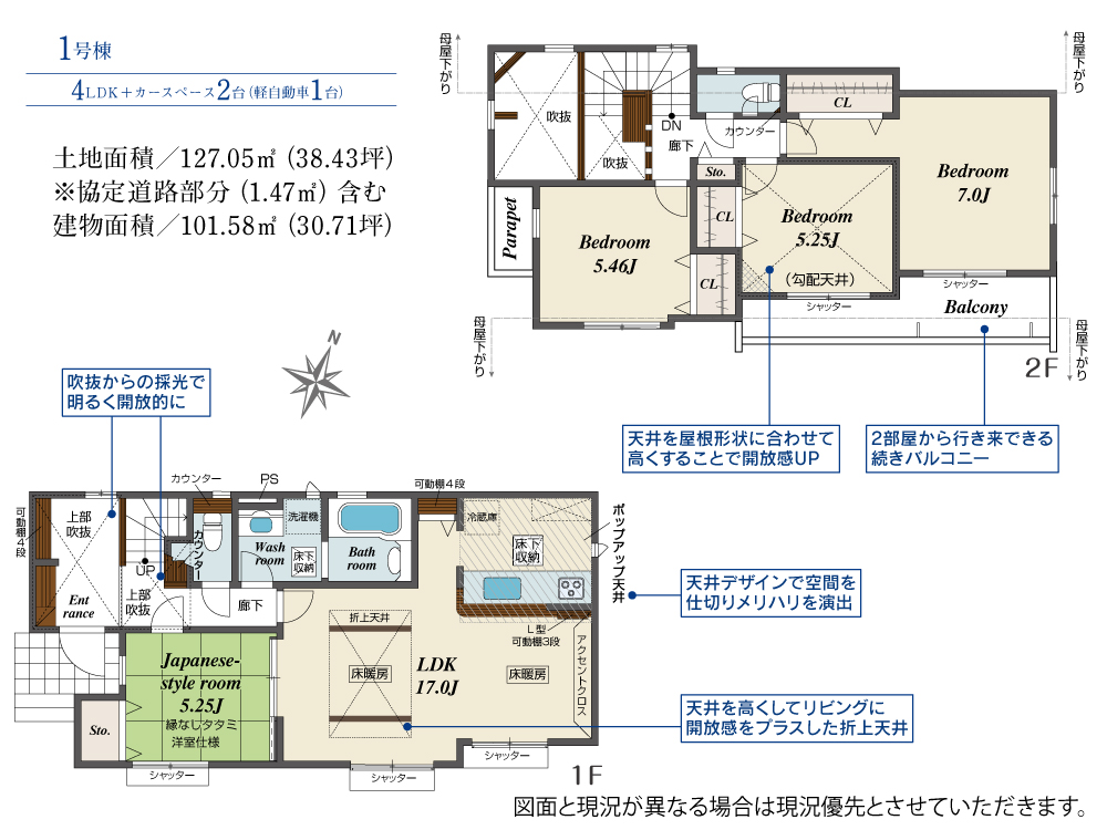 土地面積 127.05m² ・建物面積 101.58m² ・駐車場2台