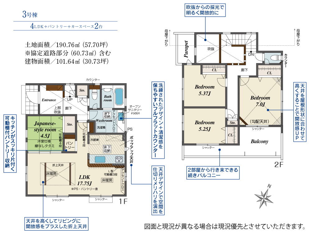 土地面積 190.76m² ・建物面積 101.64m² ・駐車場2台