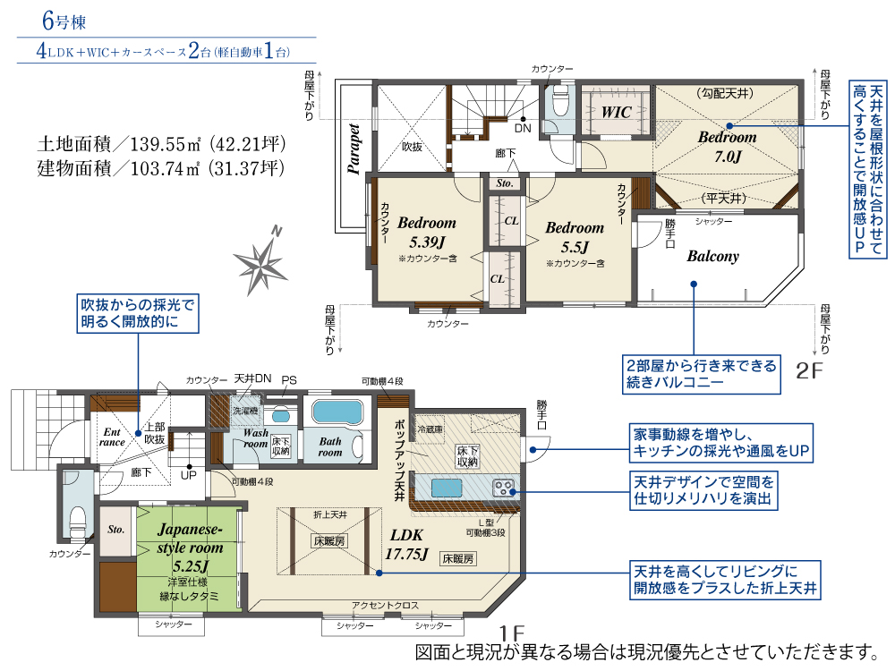土地面積 139.55m² ・建物面積 103.74m² ・駐車場2台