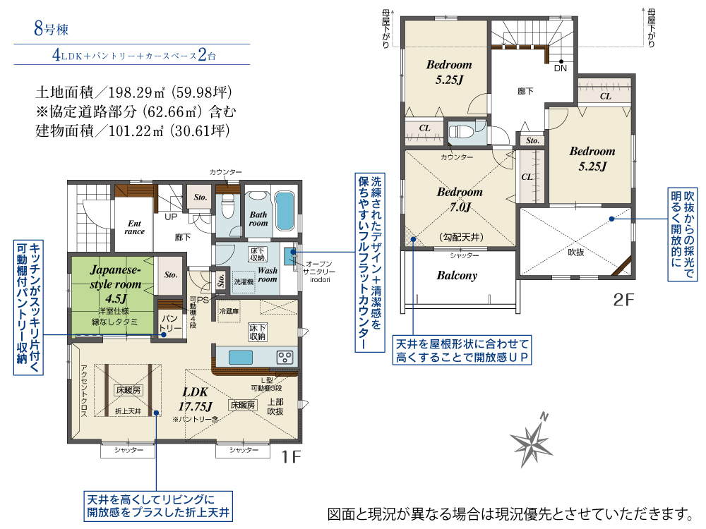 土地面積 198.29m² ・建物面積 101.22m² ・駐車場2台