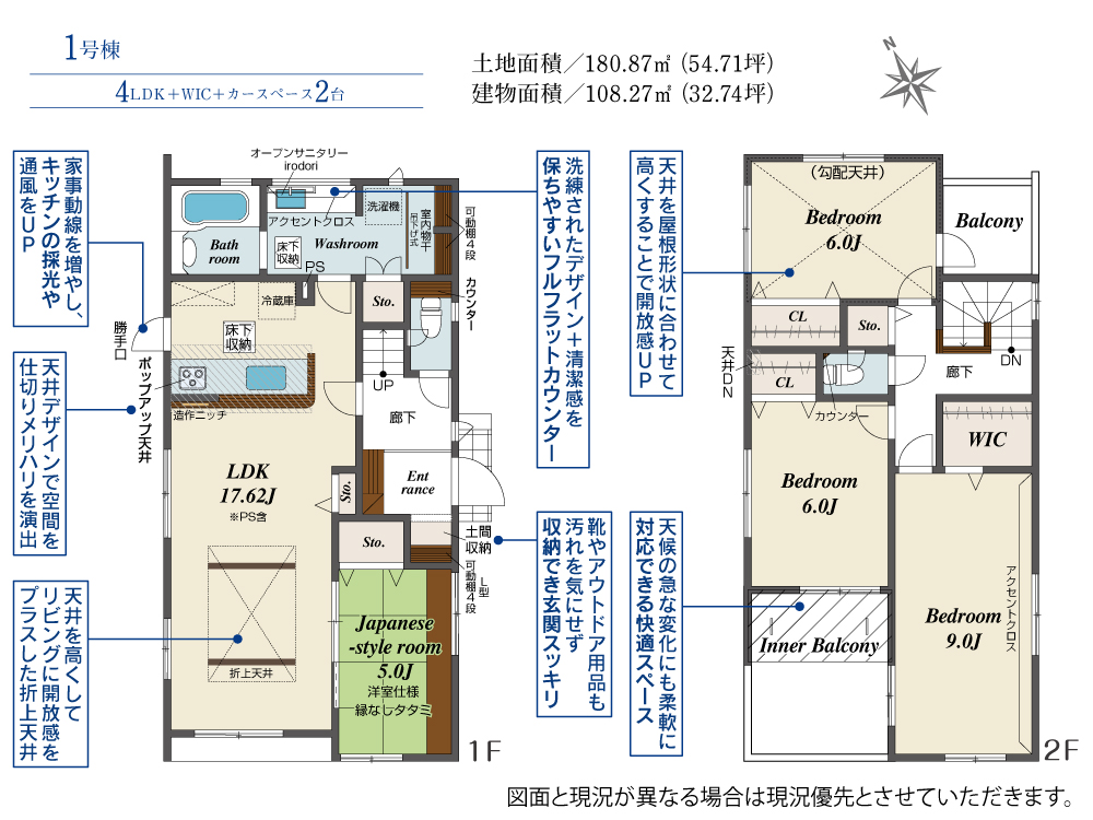 土地面積 180.87m² ・建物面積 108.27m² ・駐車場3台
