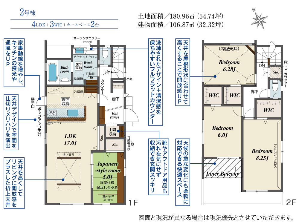 土地面積 180.96m² ・建物面積 106.87m² ・駐車場3台