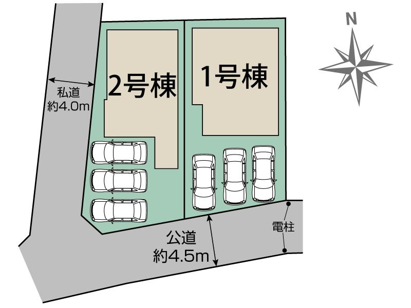 南側4.5m公道に接道で日当たりも良好♪ 1号棟:広々パントリー採用の収納豊富な4LDK ♪ 2号棟:マルチスキップ3LDK♪独立した洗面スペースにオープンサニタリー採用