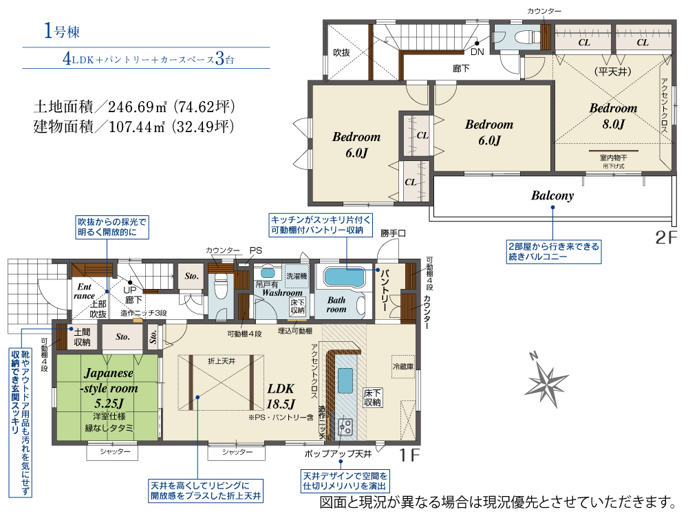 土地面積 246.69m² ・建物面積 107.44m² ・駐車場3台