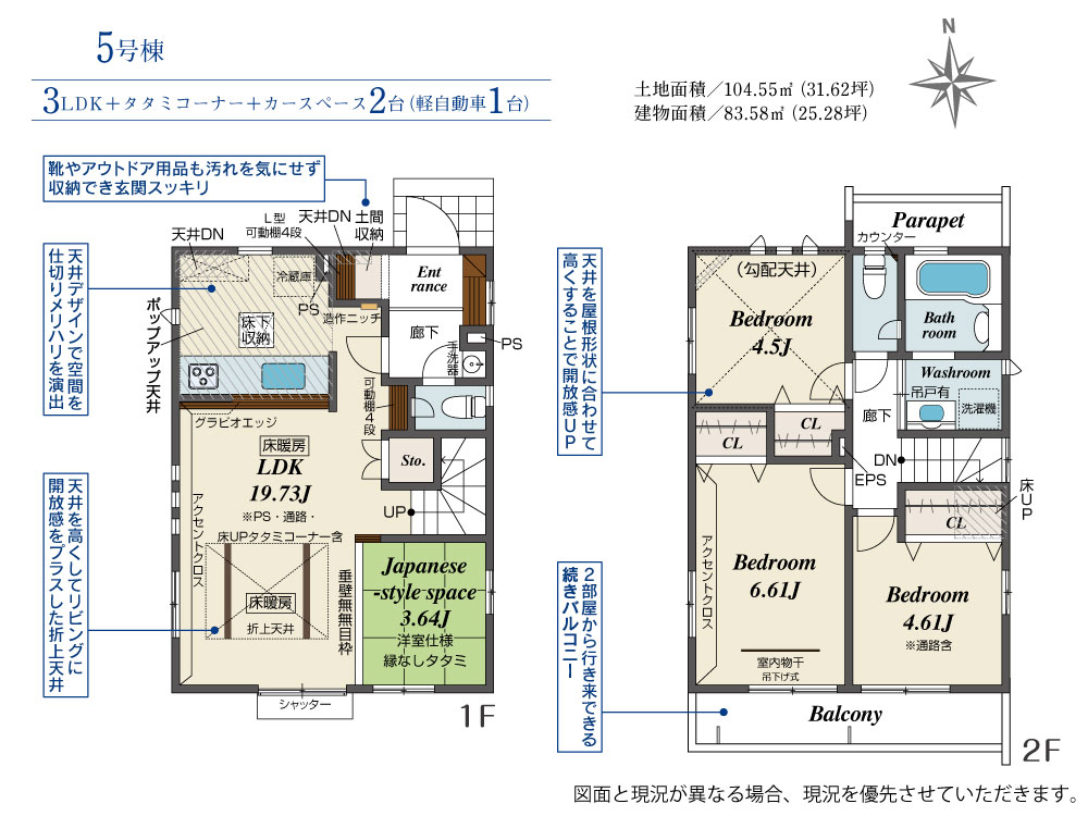 土地面積 104.55m² ・建物面積 83.58m² ・駐車場2台