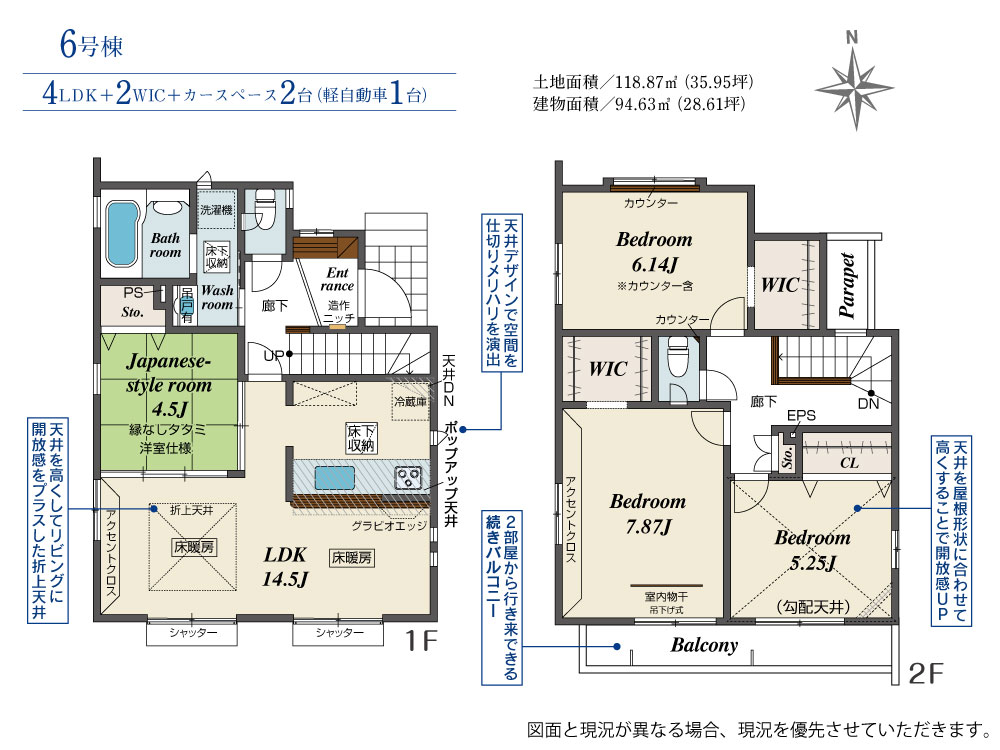 土地面積 118.87m² ・建物面積 94.63m² ・駐車場2台