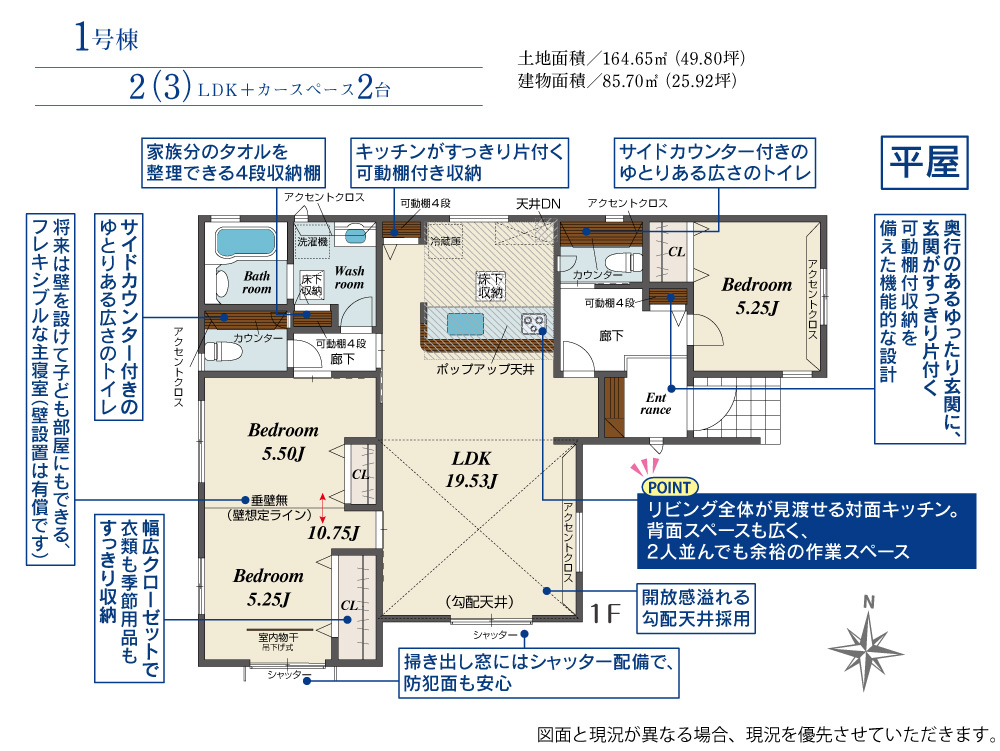 ■LDK19帖の開放感を演出する勾配天井のLDK ■将来の子ども部屋として2室に分けることも可能な主寝室 ■玄関・洗面所・キッチン横には可動棚を設け、日々の暮らしを支える収納力も充実