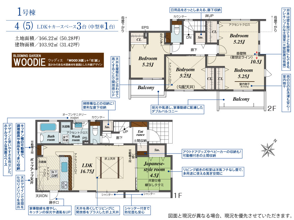 土地面積 166.22m² ・建物面積 103.92m² ・駐車場3台
