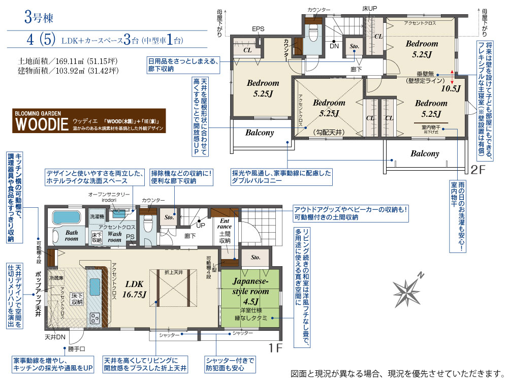 土地面積 169.11m² ・建物面積 103.92m² ・駐車場3台