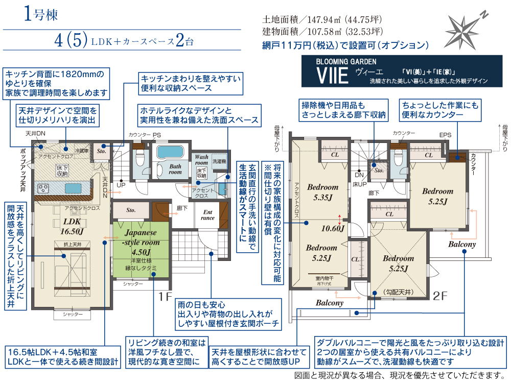 土地面積 147.94m² ・建物面積 107.58m² ・駐車場2台