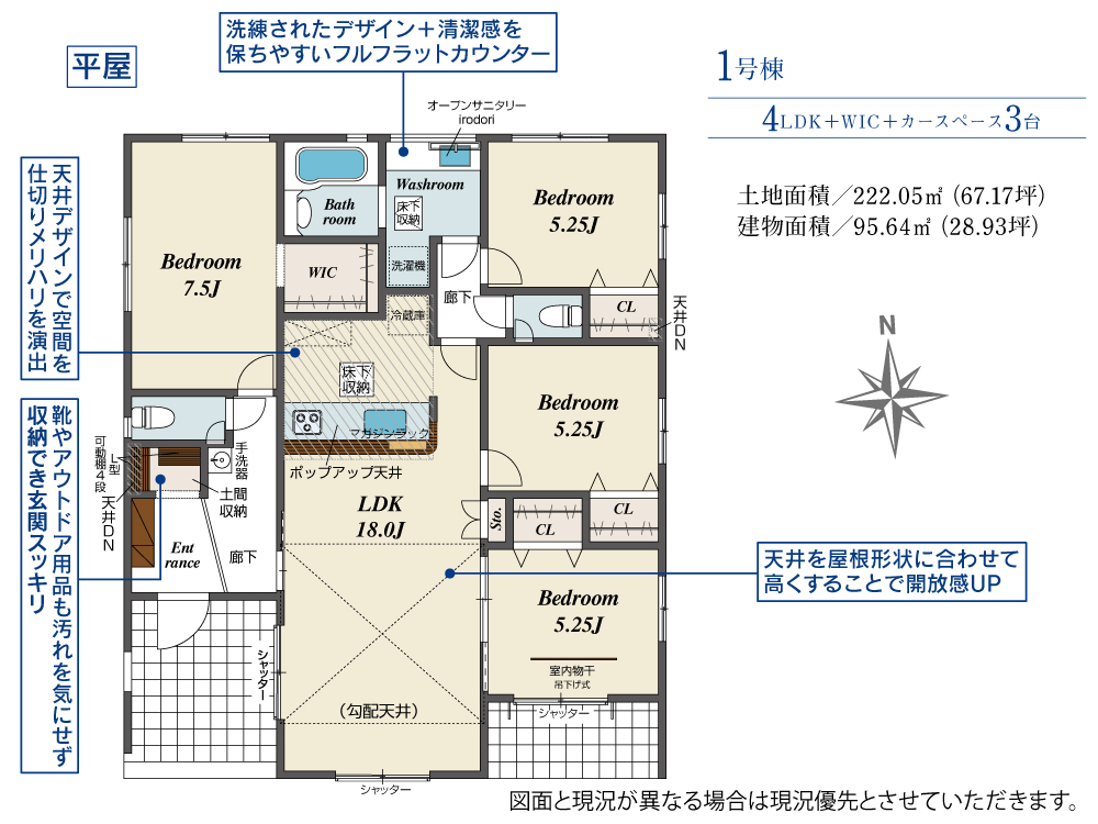 土地面積 222.05m² ・建物面積 95.64m² ・駐車場3台