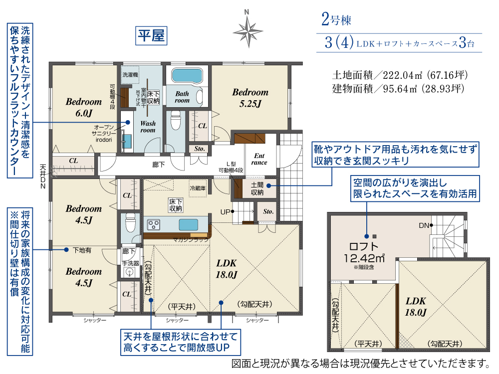 明るい空間をつくりやすい勾配天井に加え、ロフト付きでデザイン性も兼ね備えた間取り。洗面化粧台には「オープンサニタリー」を採用。シンプルモダンな空間を演出します。