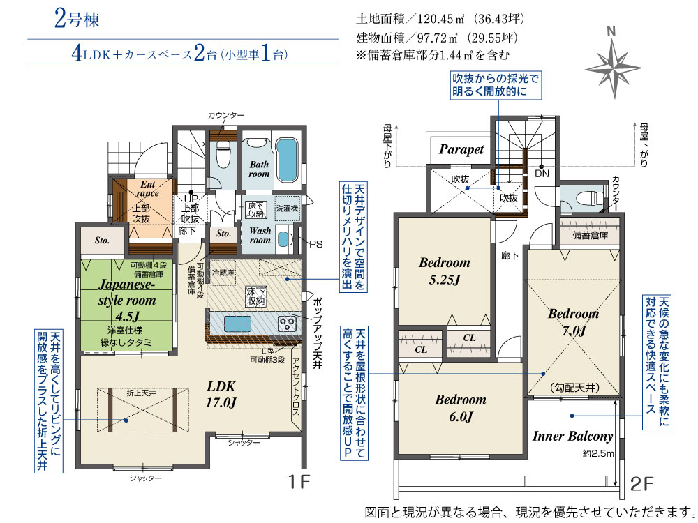 土地面積 120.45m² ・建物面積 97.72m² ・駐車場2台