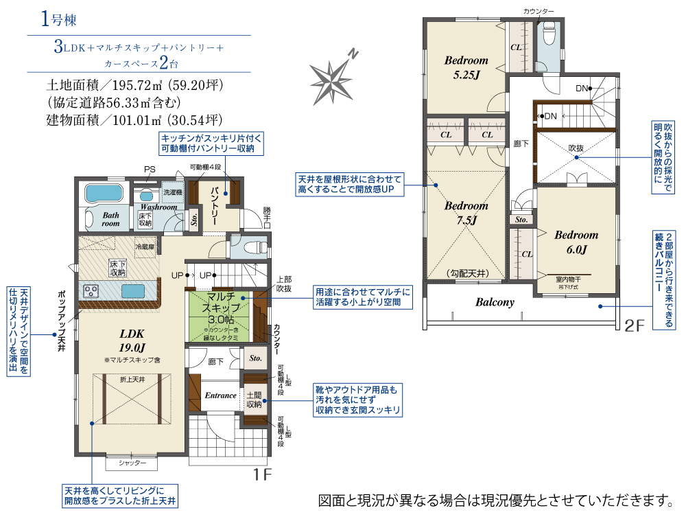 土地面積 195.72m² ・建物面積 101.01m² ・駐車場2台