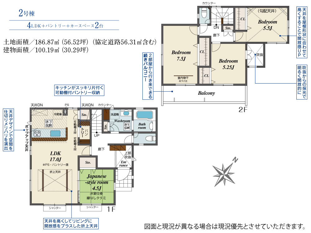 土地面積 186.87m² ・建物面積 100.19m² ・駐車場2台