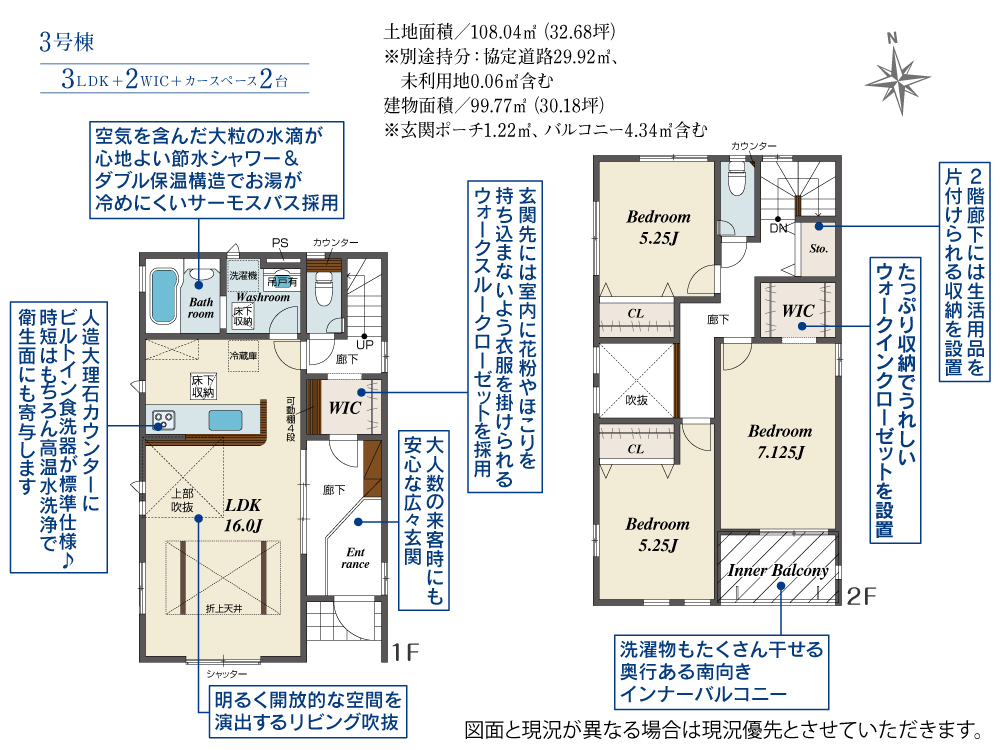 土地面積 108.04m² ・建物面積 99.77m² ・駐車場2台