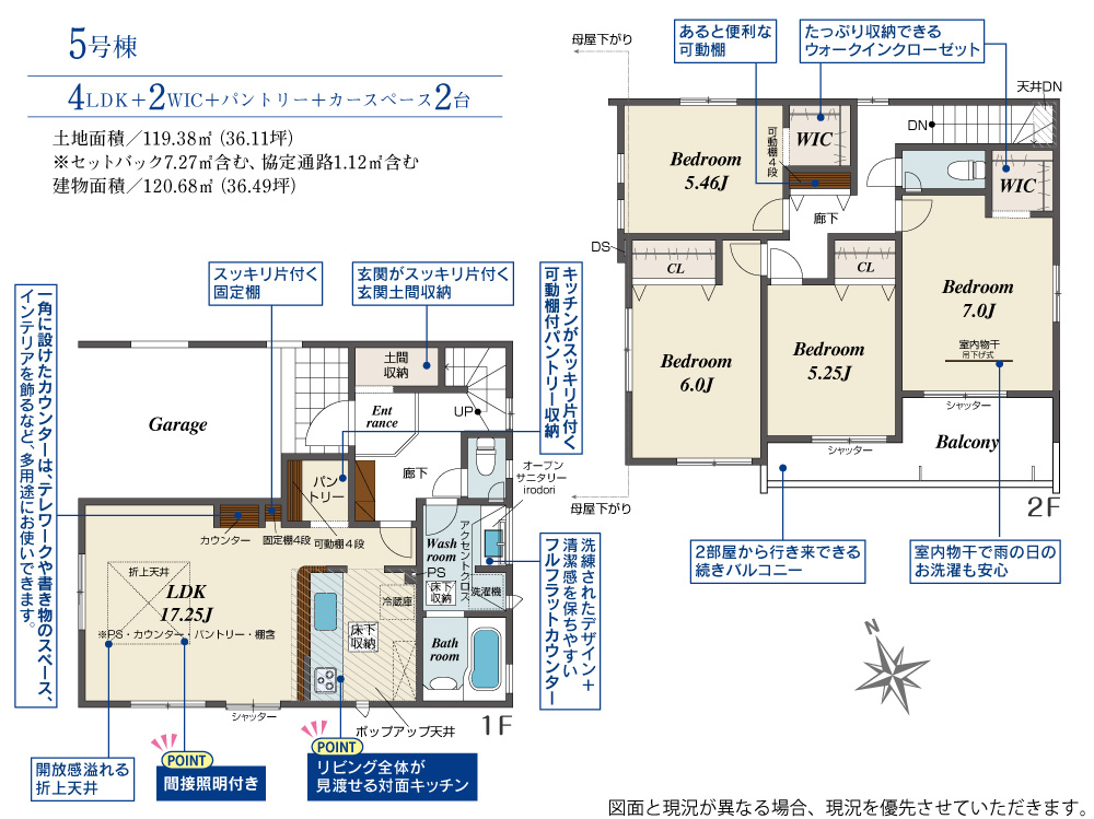 土地面積 119.38m² ・建物面積 120.68m² ・駐車場2台