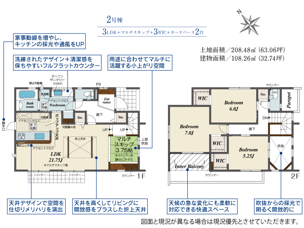 土地面積 208.48m² ・建物面積 108.26m² ・駐車場2台