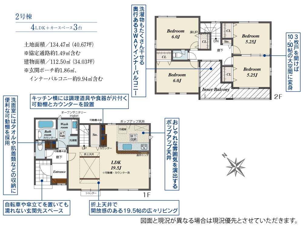 土地面積 134.47m² ・建物面積 112.50m² ・駐車場3台