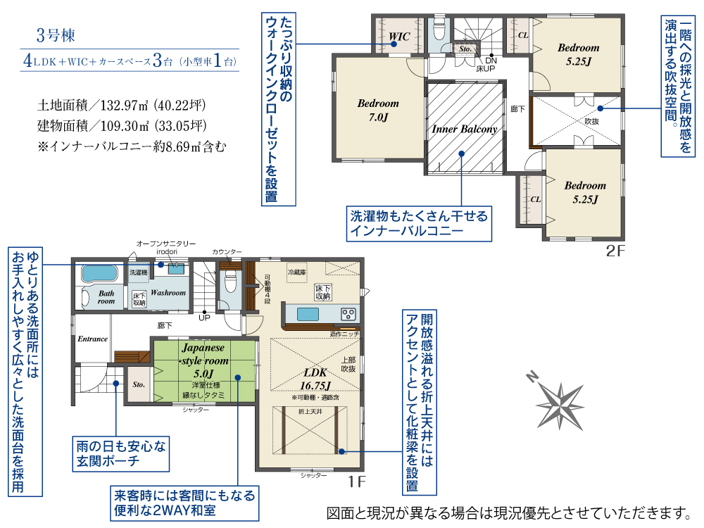 土地面積 132.97m² ・建物面積 109.30m² ・駐車場3台