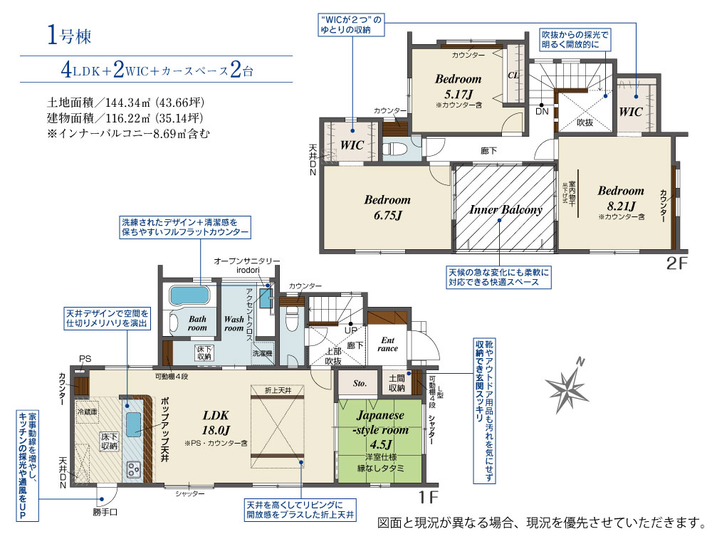 土地面積 144.34m² ・建物面積 116.22m² ・駐車場2台
