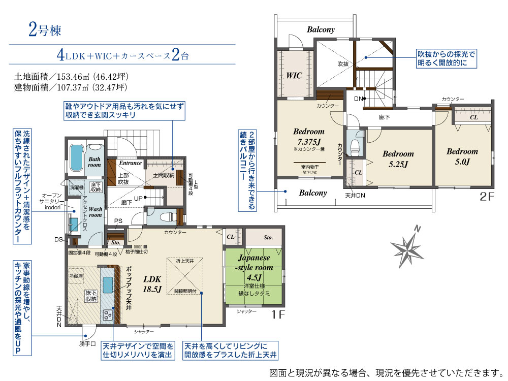 土地面積 153.46m² ・建物面積 107.37m² ・駐車場2台
