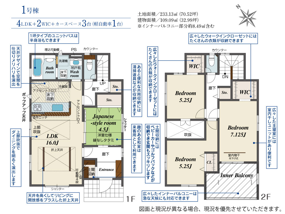 土地面積 233.13m² ・建物面積 109.09m² ・駐車場2台
