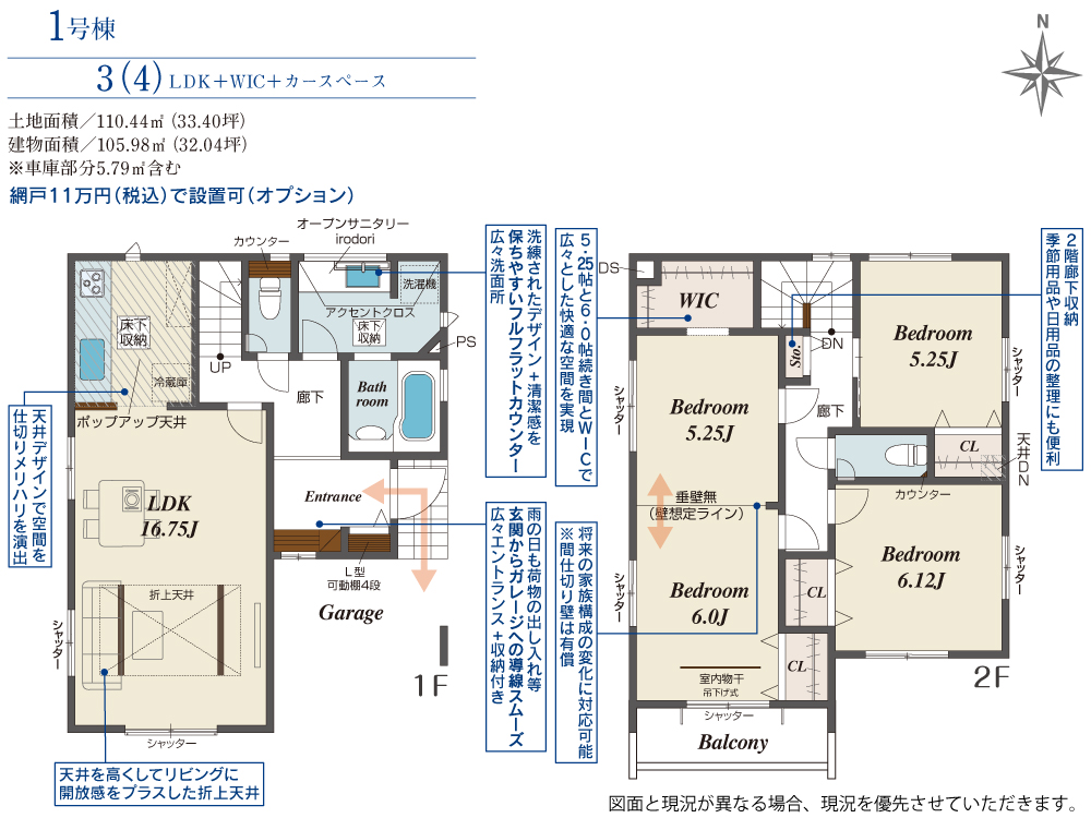 土地面積 110.44m² ・建物面積 105.98m² ・駐車場1台