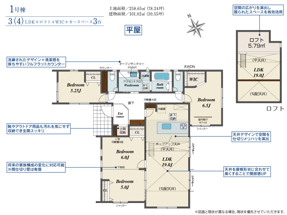 ■デザイン性と機能性を兼ね備えたオープンサニタリーirodori ■開放感と作業のしやすさが魅力のペニンシュラキッチン ■収納いろいろ、便利なロフト