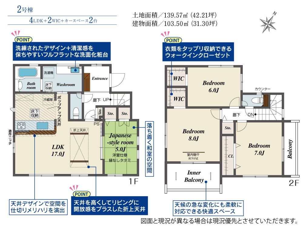 土地面積 139.57m² ・建物面積 103.50m² ・駐車場2台